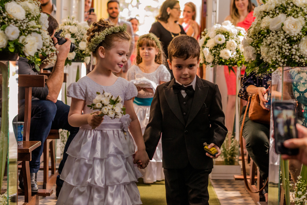Quando chega a hora da cerimônia, o suspense toma conta. Todos aguardam ansiosamente pela entrada das daminhas e dos pagens. E eles nunca decepcionam! Algumas crianças entram com a confiança de quem está acostumado aos holofotes, outras são um pouco mais tímidas, mas todas são absolutamente adoráveis.